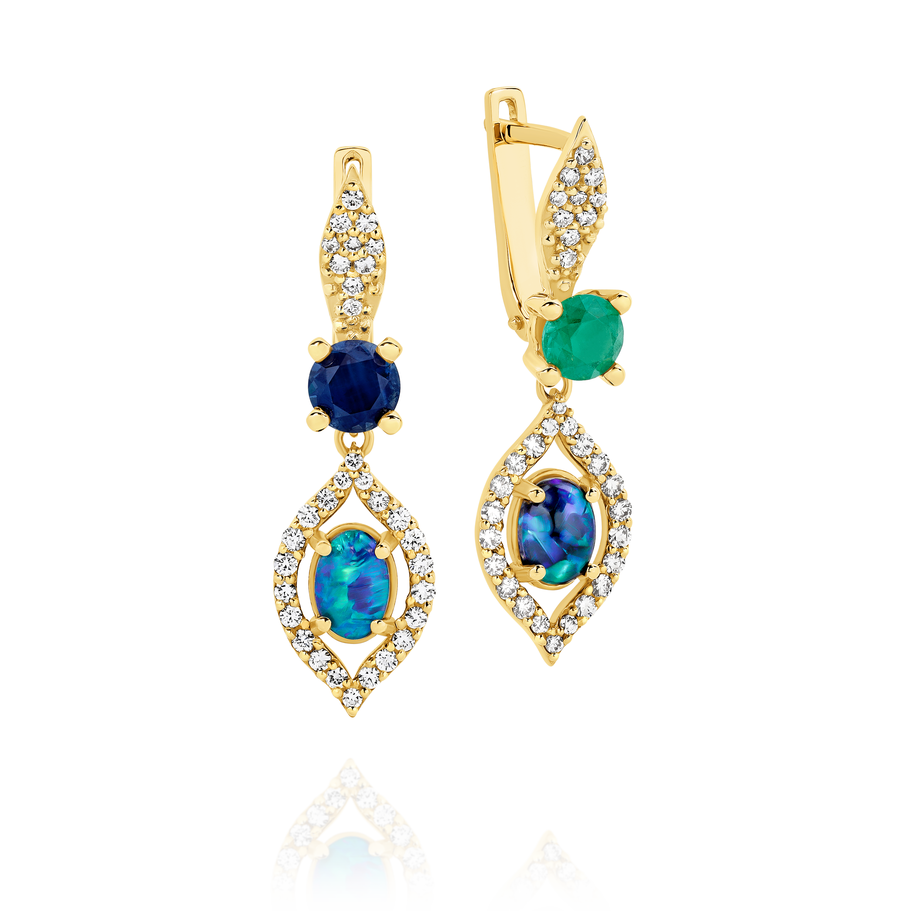 Beautiful peacock feather earrings, one of a kind design, made with Australian black Lightning Ridge oval cabachon opals (0.94 carat total). Displaying bright greens and blues play of colour on a dark base. Set into Australia 14 karat yellow gold adorned with sparkling colourless diamonds totalling 0.53 carats. (G/H SI Clarity. Featuring a mismatched pair of emerald and sapphire, round mixed cut faceting both sourced from same Mine in Ethiopia!